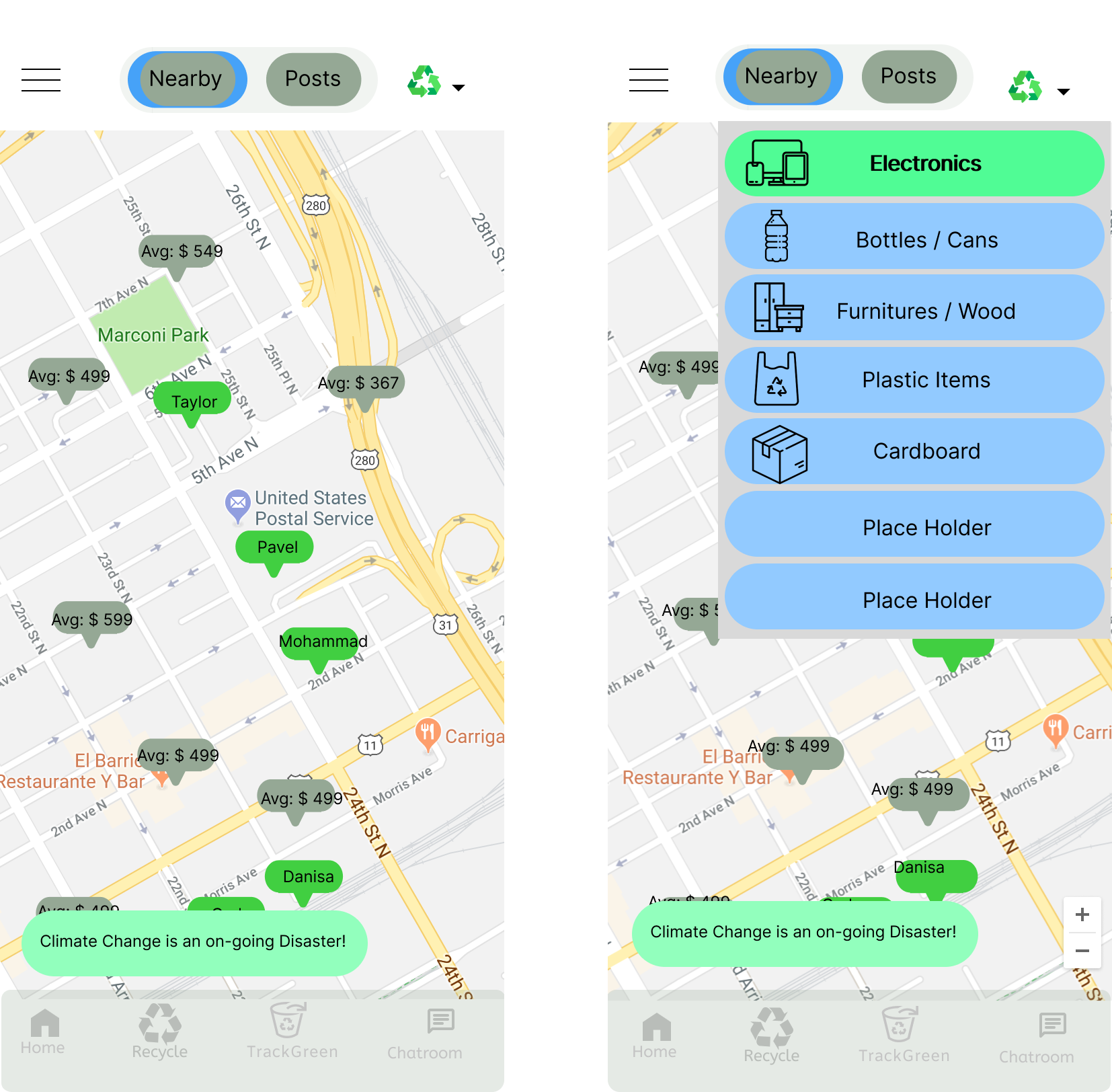This component is the main page, and it is designed to help the student to find their nearby recycling facilities through public information, such as Google Maps and Apple Map. Like other map apps, it displays the user in the center of the map with pinpoints of the nearby recycling facilities. The pinpoint not only serves for displaying the location of the facilities, but also displays the general price for one particular type of item (e.g. electronics, furniture, clothes, etc.). This part learns from the gas price checking feature from Google Maps. The user can view the price for different types of item by clicking the desired particular type in a category dropdown. This could help the user to compare the prices among the facility to get the best deal for the recycling item and the location of the facilities.